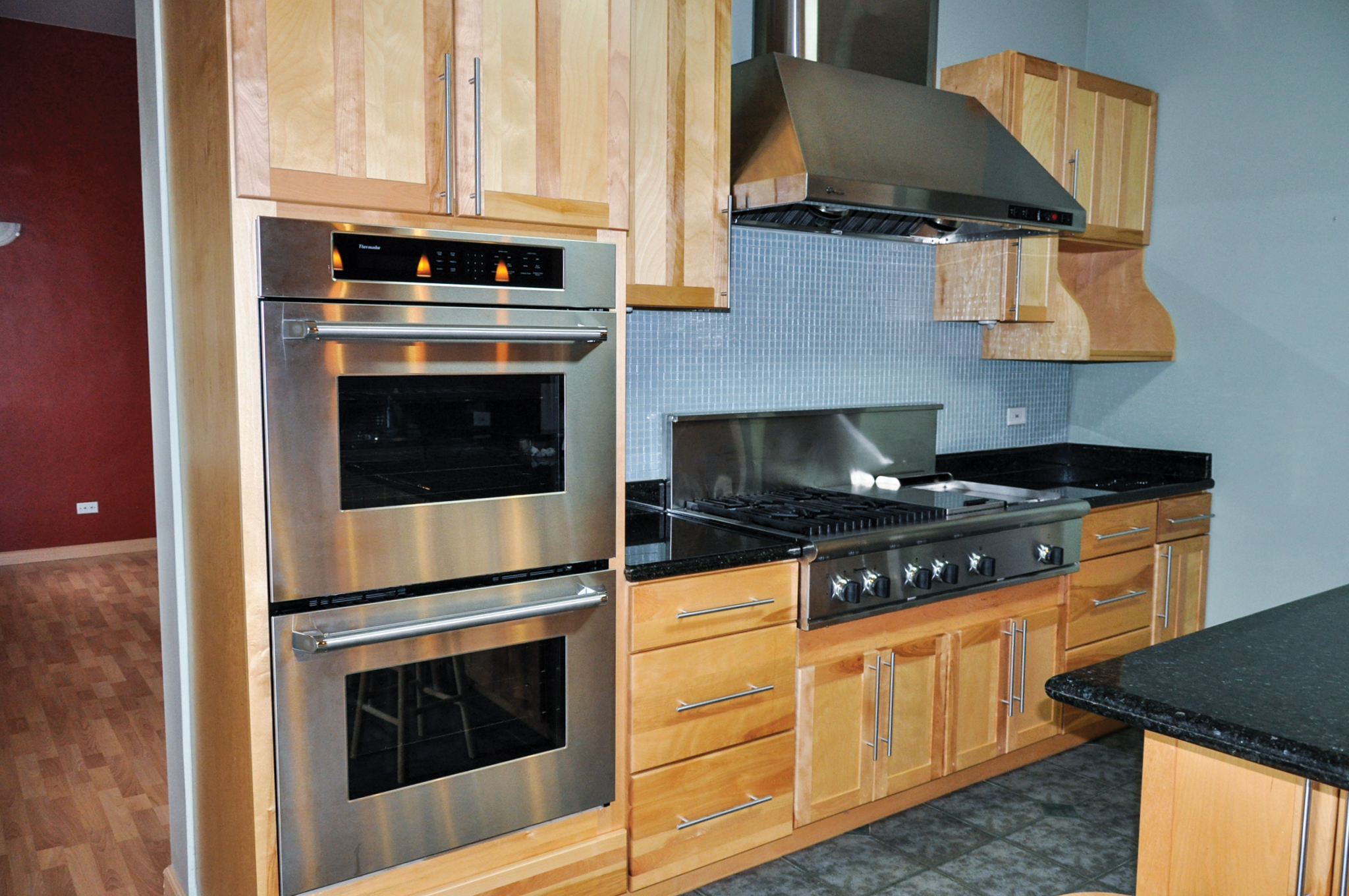 The kitchen comes with modern Thermador™ appliances such as a commercial oven, stovetop, and refrigerator, all of which are stainless steel. The countertops are made of granite that adds earthy tones to complement the kitchen’s contemporary feel, which you can expect all your guests to be impressed with.